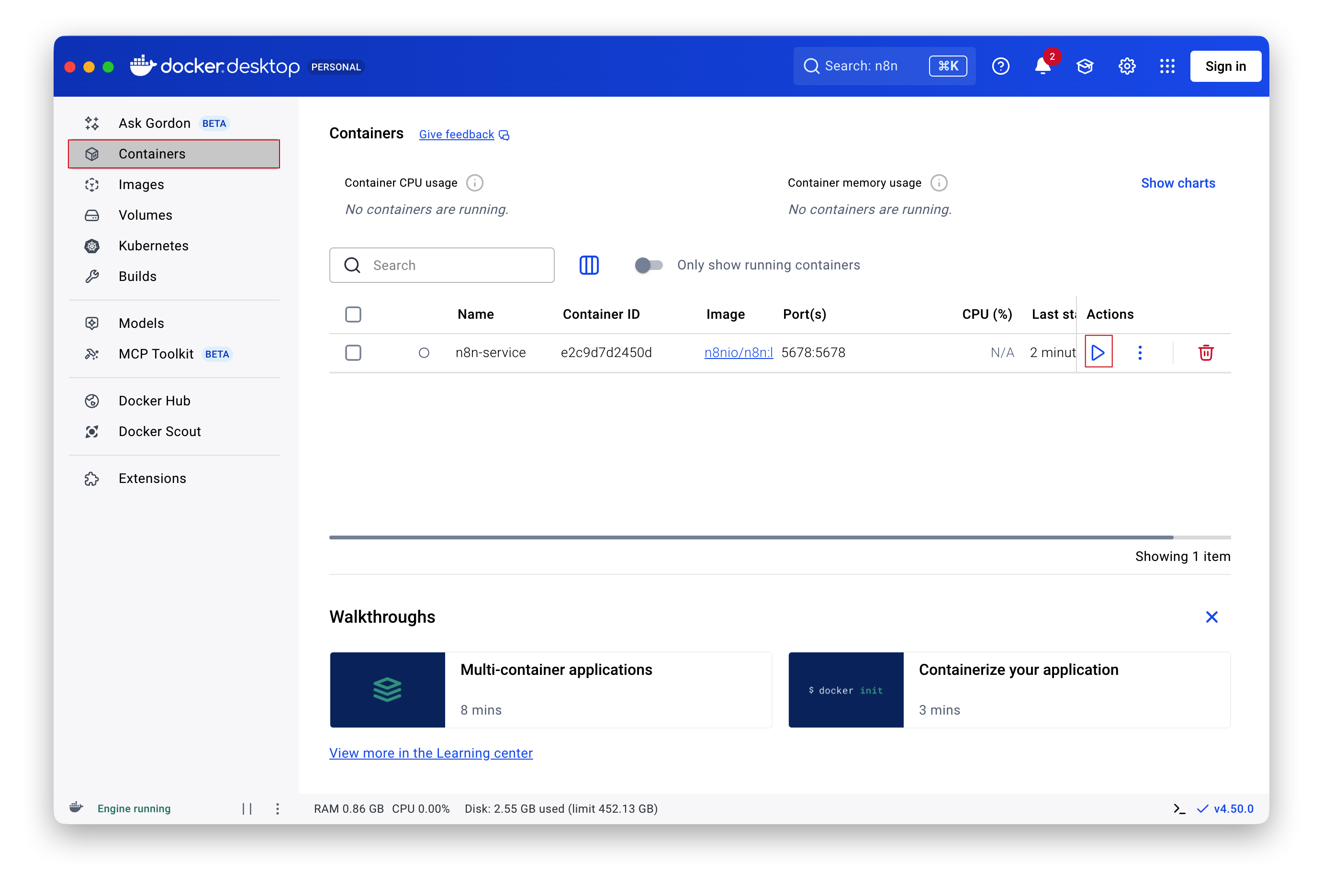 # 拉取并运行 n8ndocker run -it --rm \ --name n8n \ -p 5678:5678 \ -v ~/.n8n:/home/node/.n8n \ docker.n8n.io/n8nio/n8nDocker Compose 部署#